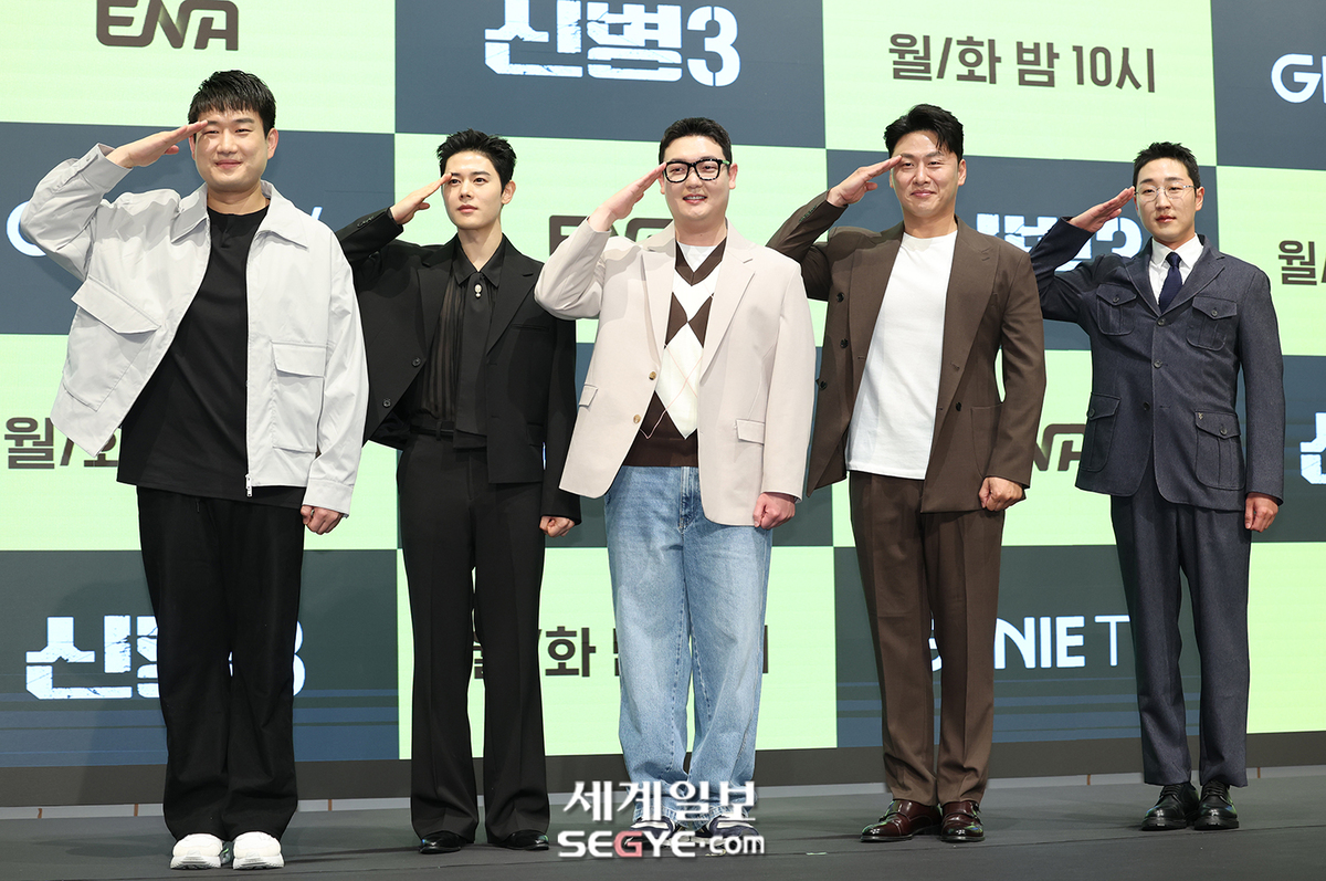 배우 남태우, 이동준, 김민석, 오대환, 김현규(사진 왼쪽부터)가 7일 서울 신도림동 디큐브시티 더 세인트에서 진행된 지니TV 오리지널 '신병3' 제작발표회에 참석해 포즈를 취하고 있다.