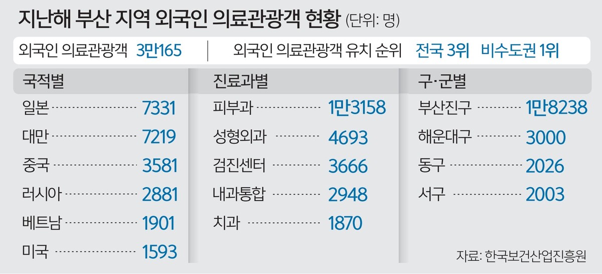 한국보건산업진흥원 자료에 따르면 지난해 부산을 찾은 의료관광객을 국적별로 살펴보면 일본이 24.3%로 가장 많았고 대만(23.9%), 중국(11.8%), 러시아(9.5%), 베트남(6.3%), 미국(5.2%) 등이 뒤를 이었다. 특히 대만 의료관광객은 2023년에 비해 무려 1840%(372명→7219명) 급증했다. 일본(209%)과 중국(117%), 몽골(110%) 등도 높은 증가율을 보였다. 일본과 중화권 관광객의 피부과 방문과 몽골의 건강검진이 늘어난 게 주된 요인으로 파악됐다.
