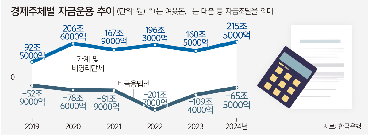 10일 한국은행이 발표한 ‘2024년 자금순환(잠정)’에 따르면 지난해 가계 및 비영리단체의 순자금운용액은 215조5000억원으로 2023년(150조5000억원)보다 55조원 늘었다. 순자금운용액은 예금·투자 등 자금운용액에서 대출 등 자금조달액을 뺀 값으로 여유자금을 뜻한다. 지난해 가계 순자금운용액은 2009년 통계 편제 이후 최대치다.