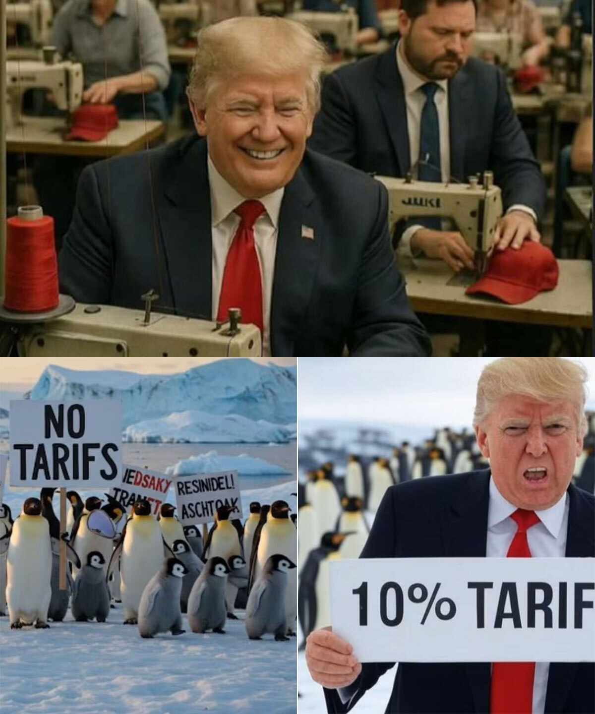 도널드 트럼프 미국 행정부가 제조업 부흥을 내세우며 전 세계를 대상으로 관세전쟁에 나서자, 이를 조롱하는 밈(meme·유행 콘텐츠)이 인터넷상에서 빠른 속도로 퍼지고 있다. 트럼프 대통령과 J D 밴스 부통령이 재봉틀로 ‘MAGA(미국을 다시 위대하게) 모자’를 만드는 합성 이미지(위)와 10%의 기본 상호관세 목록에 올라간 남극 인근 호주령 허드 맥도널드 제도에 서식하는 펭귄들이 ‘관세 반대(NO TARIFFS)’ 팻말을 들고 시위하는 합성 이미지.