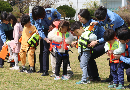 14일 부산 영도구 부산해양경찰서 잔디광장에서 경찰관들이 어린이집 원생들에게 구명조끼의 올바른 착용 방법 등을 설명하고 있다.