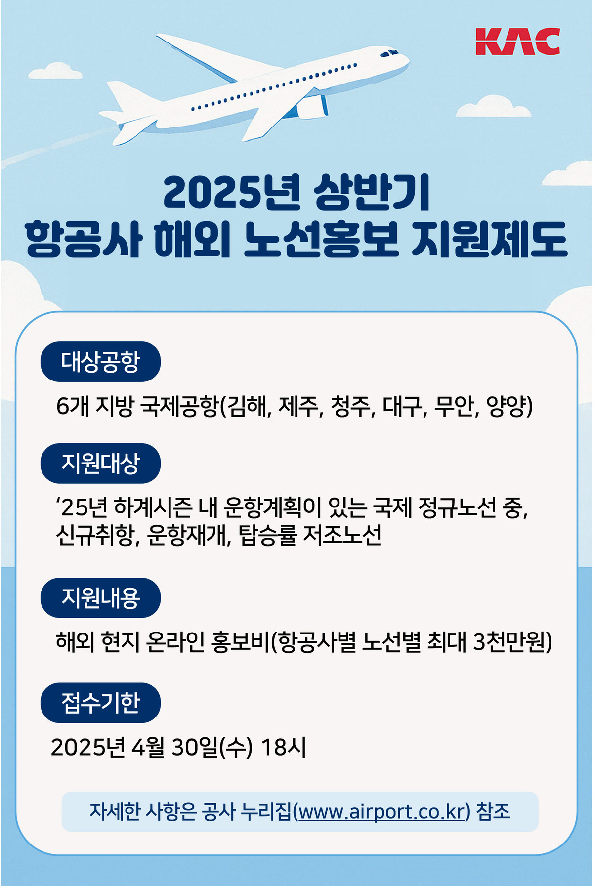 선정된 항공사는 해외 현지에서 5월부터 11월까지 검색엔진 키워드 광고, SNS 배너 광고 등 온라인 홍보를 시행하고 공사는 최대 3000만원까지 지원한다.
