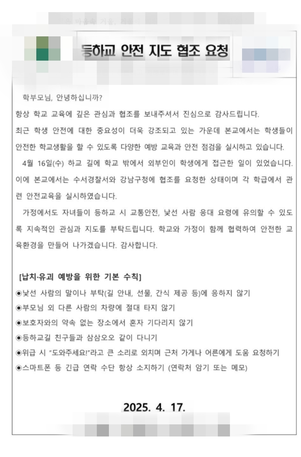 A 초등학교는 다음날 가정통신문을 통해 “16일 하교 길에 학교 밖에서 외부인이 학생에게 접근한 일이 있었다”고 공개했다. 그러면서 “등하교시 교통안전, 낯선 사람 응대 요령에 유의할 수 있도록 지속적인 관심과 지도를 부탁한다”고 당부했다.