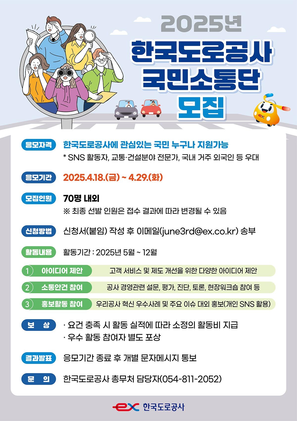 한국도로공사에 관심 있는 국민 누구나 지원 가능하며, 29일까지 모집을 받아 성별, 연령, 지역, 직업 등을 종합적으로 고려해 70명이 선발된다. 국민소통단은 활동비가 지급되고 우수 참여자에게는 사장 표창과 포상비가 지급된다. 도로공사 홈페이지(http://www.ex.co.kr)에서 지원서를 받을 수 있다.