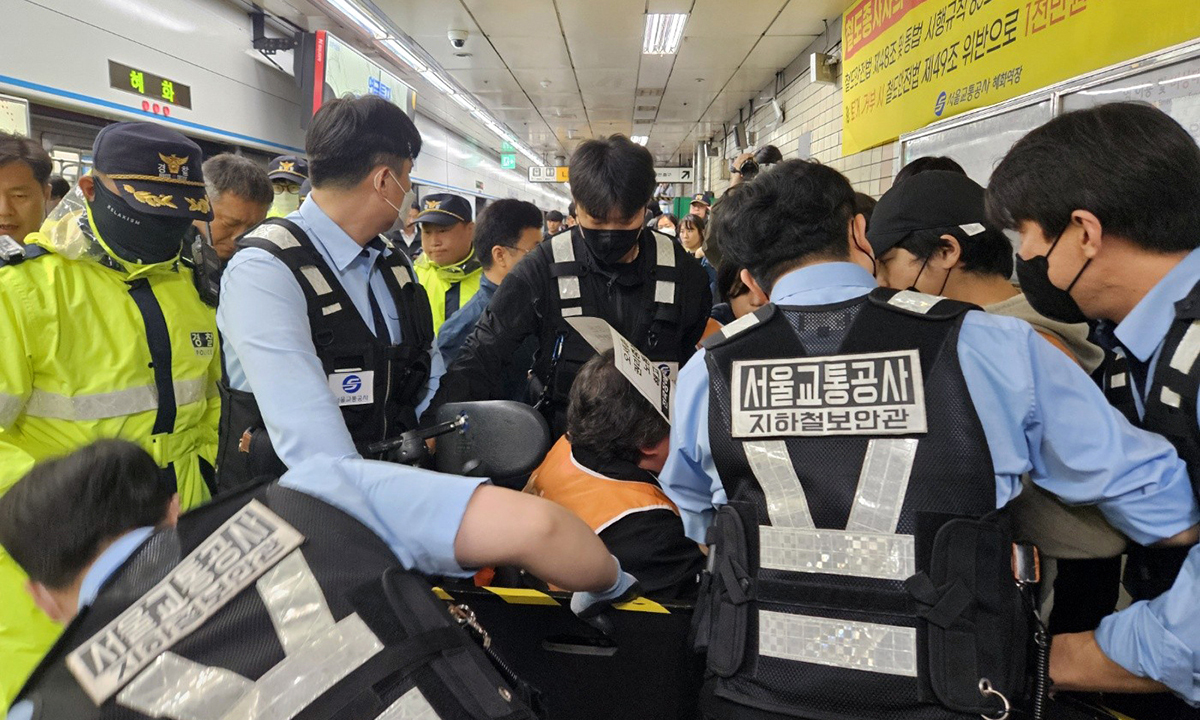 그러나 서울교통공사 측은 ‘철도안전법 위반’을 들며 이들을 막아섰다. 퇴거 요청에도 전장연이 불응하자 공사 측은 오전 8시16분쯤 지하철보안관 등을 동원해 이들을 역 바깥으로 강제 퇴거 조치했다.