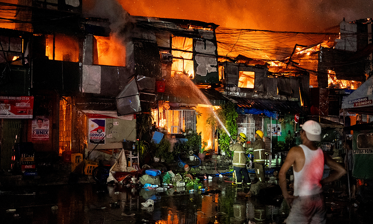 23일(현지시간) 필리핀 마닐라 항구 지역의 빈민가에서 발생한 대형 화재를 소방관들이 진입하고 있다. 화재로 인해 약 300가구의 가옥과 집기가 전소하는 등 큰 피해가 발생했다. 필리핀 수도 마닐라의 해안을 따라 자리잡은 빈민가는 가옥 대부분이 화재에 극도로 취약한 목조주택인 데다 소방시설이 제대로 갖춰져 있지 않아 대형 화재 발생이 잦다.
