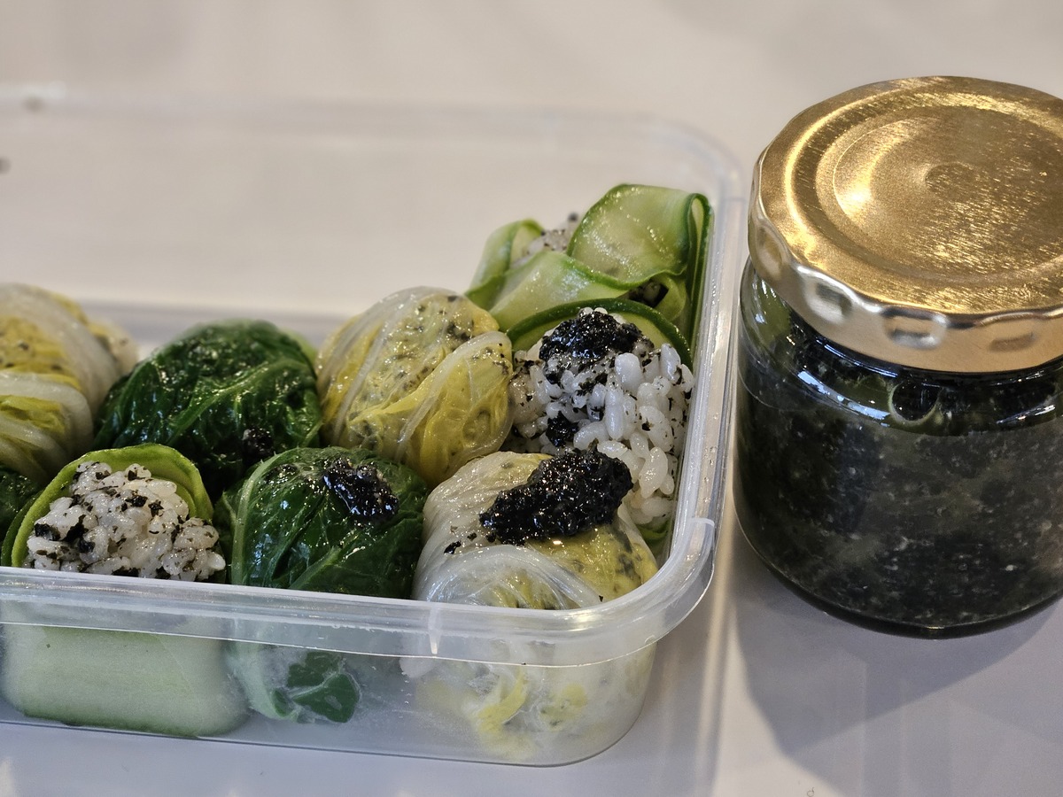쿠첸 그레인 밥솥으로 지은 밥에 김을 갈아 만든 김페스토를 넣고 비빈 뒤 제철 채소로 감싸주면 ‘쌈밥’ 한 끼 완성. 짭조름하면서도 부드러운 식감 덕분에 밥 한 공기가 금세 뱃속으로 사라졌다.