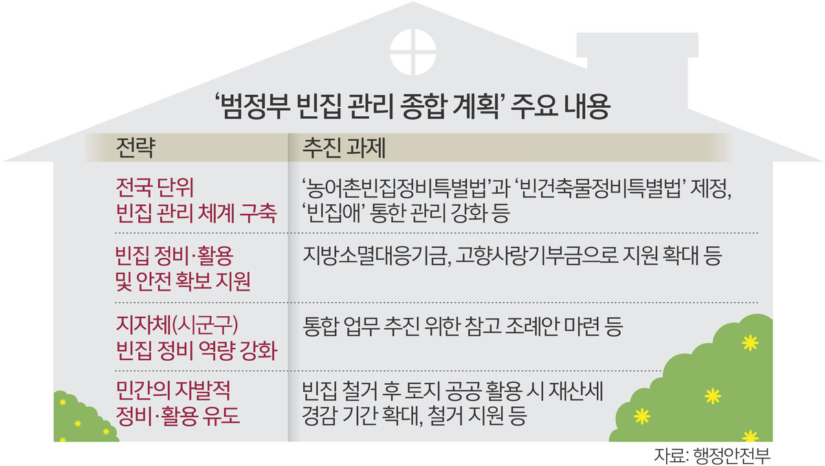 정부는 국가와 지방자치단체, 민간이 함께 빈집을 관리할 수 있는 기반을 마련한다. ‘농어촌빈집정비특별법’과 ‘빈건축물정비특별법’을 제정해 국가와 소유자의 책무를 강화하고, 현행 농어촌정비법과 소규모주택정비법상 달리 규정된 빈집의 정의 등도 일원화할 방침이다. 지난해 행정조사에 따르면 전국의 빈집은 13만4009호로, 이 중 5만7223호(42.7%)가 89개 인구감소지역에 있다. 유형별로는 단독주택(9만8082호), 다세대주택(7075호), 아파트(2617호) 등 순이다.