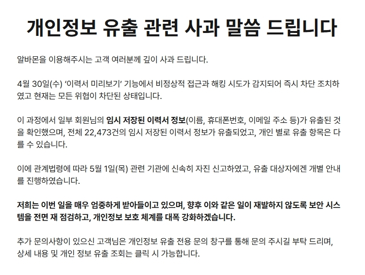 다만 “이 과정에서 일부 회원의 임시저장 이력서 정보가 유출된 것을 확인했다”며 “전체 2만2473건의 임시저장된 이력서 정보가 유출됐고, 개인별로 유출 항목은 다를 수 있다”고 알바몬은 설명했다. 임시저장 이력서의 정보로는 이름·휴대전화번호·이메일 주소 등이 포함됐다면서다.