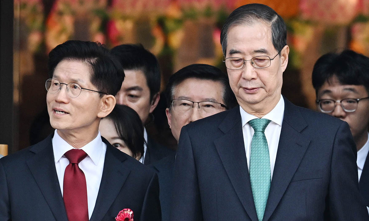 국민의힘 김문수 대선 후보(왼쪽)와 무소속 한덕수 대선 예비후보가 5일 서울 종로구 조계사에서 봉축법요식에 입장하고 있다. 연합뉴스