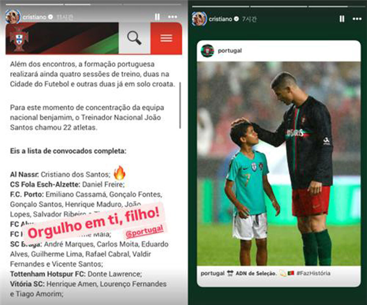 호날두는 SNS에 "아들아, 자랑스럽다!"는 글과 함께 호날두 주니어의 대표팀 승선 소식을 전했다.