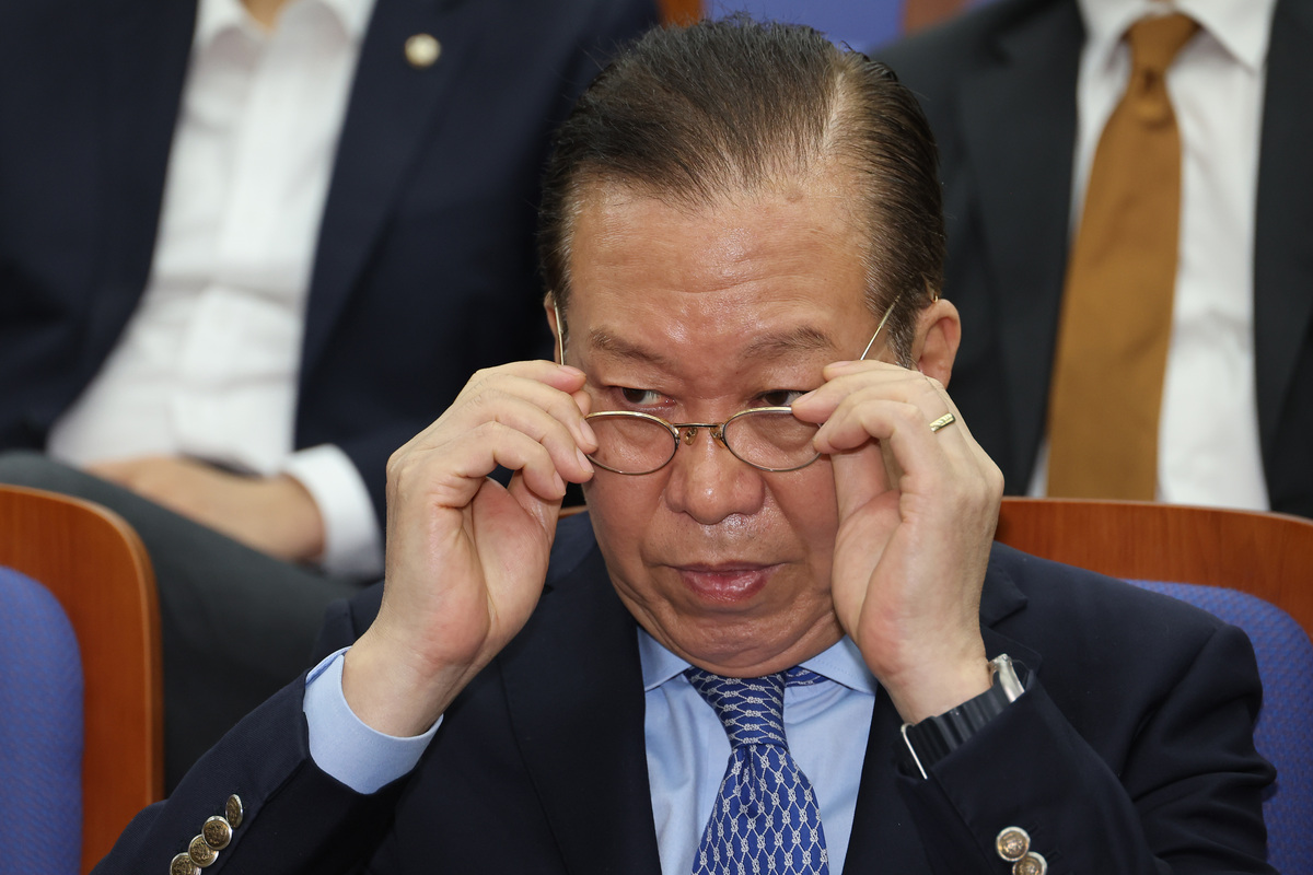 국민의힘 권영세 비상대책위원장이 8일 서울 여의도 국회에서 열린 의원총회에서 안경을 고쳐쓰고 있다.    연합뉴스