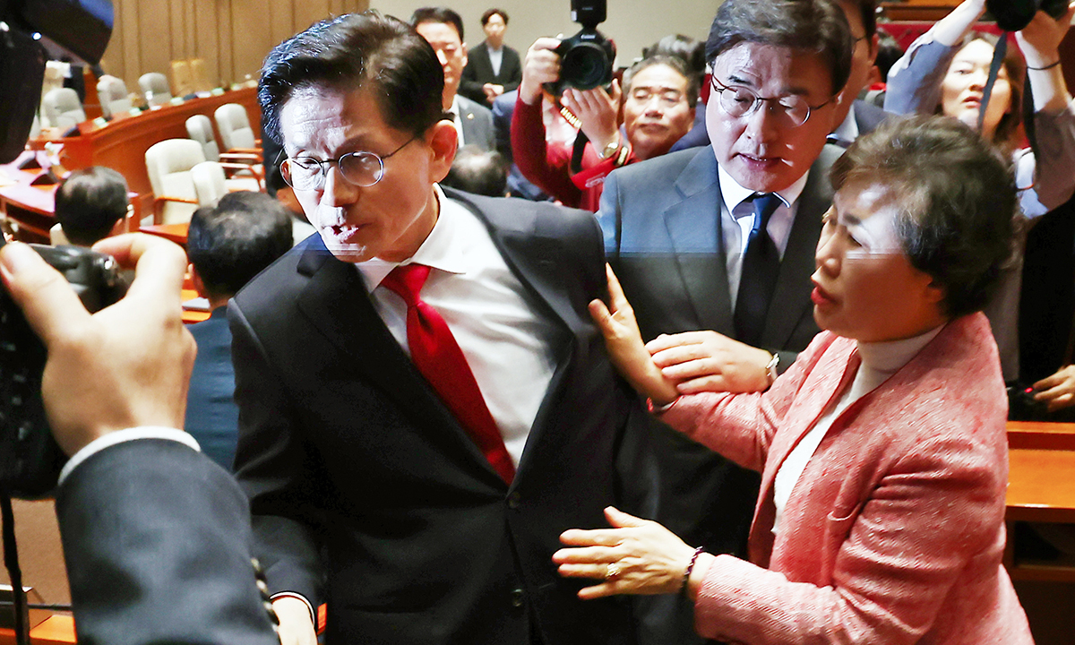 ‘대선후보 등록 후 단일화’를 주장하며 당 지도부와 마찰을 빚고 있는 국민의힘 김문수 대선후보가 9일 당 의원총회를 찾아 현재의 단일화 시도를 ‘강제 단일화’로 규정, 기존 입장을 바꾸지 않았다. 김 후보는 무소속 한덕수 예비후보와의 단일화 추진은 자신을 끌어내리고 한 후보를 국민의힘 후보로 만들기 위한 반 민주적 시도라는 취지의 발언을 한 뒤 의총장을 떠나버렸다. 국민의힘 의원들은 격분했고 항의성 발언도 쏟아졌다.