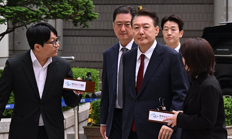 윤 전 대통령은 '끌어내라는 지시 있었다는 증언이 이어지는 데 입장이 있느냐', '비상계엄에 대해 사과할 생각이 있느냐' 등 취재진 질문에 아무런 답을 하지 않고 법정으로 직행했다.