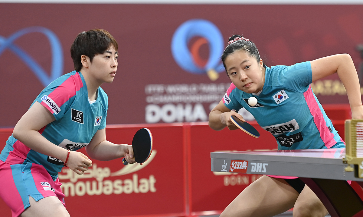 신유빈(대한항공·오른쪽)-유한나(포스코인터내셔널) 조가 21일 카타르 도하 루사일 스포츠아레나에서 열린 2025 국제탁구연맹(ITTF) 세계선수권대회 여자복식 16강전에서 독일의 아네트 카우푸만-샤오나 샨 조를 상대로 경기하고 있다. 신-유 조는 3-1로 승리해 8강에 올랐다. 이은혜(대한항공)-김나영(포스코인터내셔널) 조도 대만의 정이징-리유준 조를 3-1 물리치고 동반 8강 진출에 성공했다.