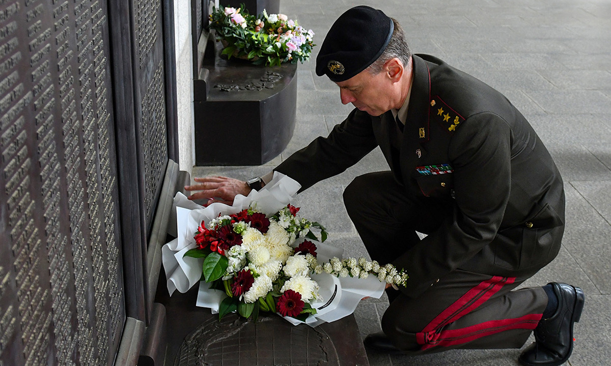 카스파르스 푸단스 라트비아 국방참모총장이 지난 24일 서울 용산구 전쟁기념관을 방문해 6·25전쟁에 참전한 라트비아계 미국 전사자명비에 헌화하고 있다. 푸단스 총장은 “라트비아계 미군의 이름이 새겨진 전사자명비에 헌화하고 추모할 수 있어서 뜻깊다”며 “이번 방문을 통해 6·25전쟁의 역사를 깊이 알고 양국 간 이해를 높일 수 있었다”고 소감을 밝혔다.