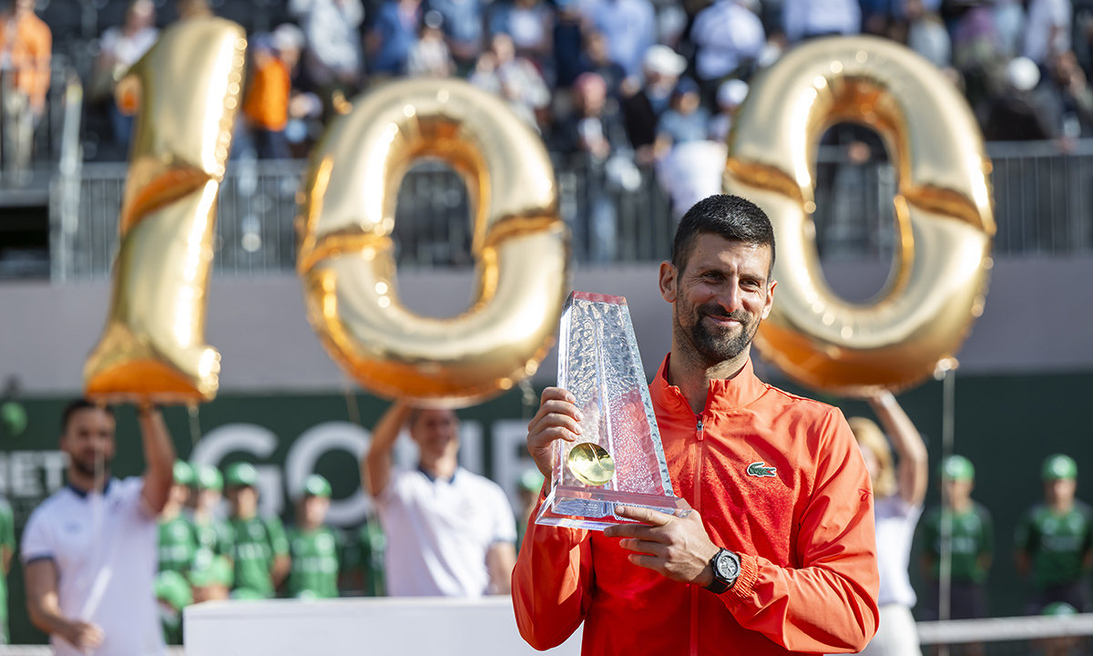 노바크 조코비치(세르비아)가 25일(한국시간) 스위스 제네바에서 열린 남자프로테니스(ATP) 투어 제네바오픈 단식 결승에서 우승을 차지한 뒤 트로피를 든 채 기념사진을 찍고 있다. 조코비치의 이번 우승으로 ATP 투어 이상급 대회에서 통산 100번째 남자 단식 트로피를 들어올렸다. ATP 투어 이상급 대회 단식 100회 우승은 지미 코너스(109회·미국)와 로저 페더러(103회·스위스)에 이어 세 번째다. 조코비치는 프로 선수들의 메이저 대회 출전이 허용된 1968년 이후 20년간 한 해도 거르지 않고 매 시즌 우승을 차지한 최초의 선수도 됐다.
