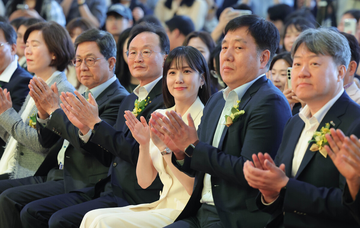 이환주 KB국민은행장과 배우 박은빈, 이달곤 동반성장위원회 위원장 등 참석자들이 26일 서울 강남구 코엑스에서 열린 2025 제1차 KB굿잡 우수기업 취업박람회에서 박수를 치고 있다.