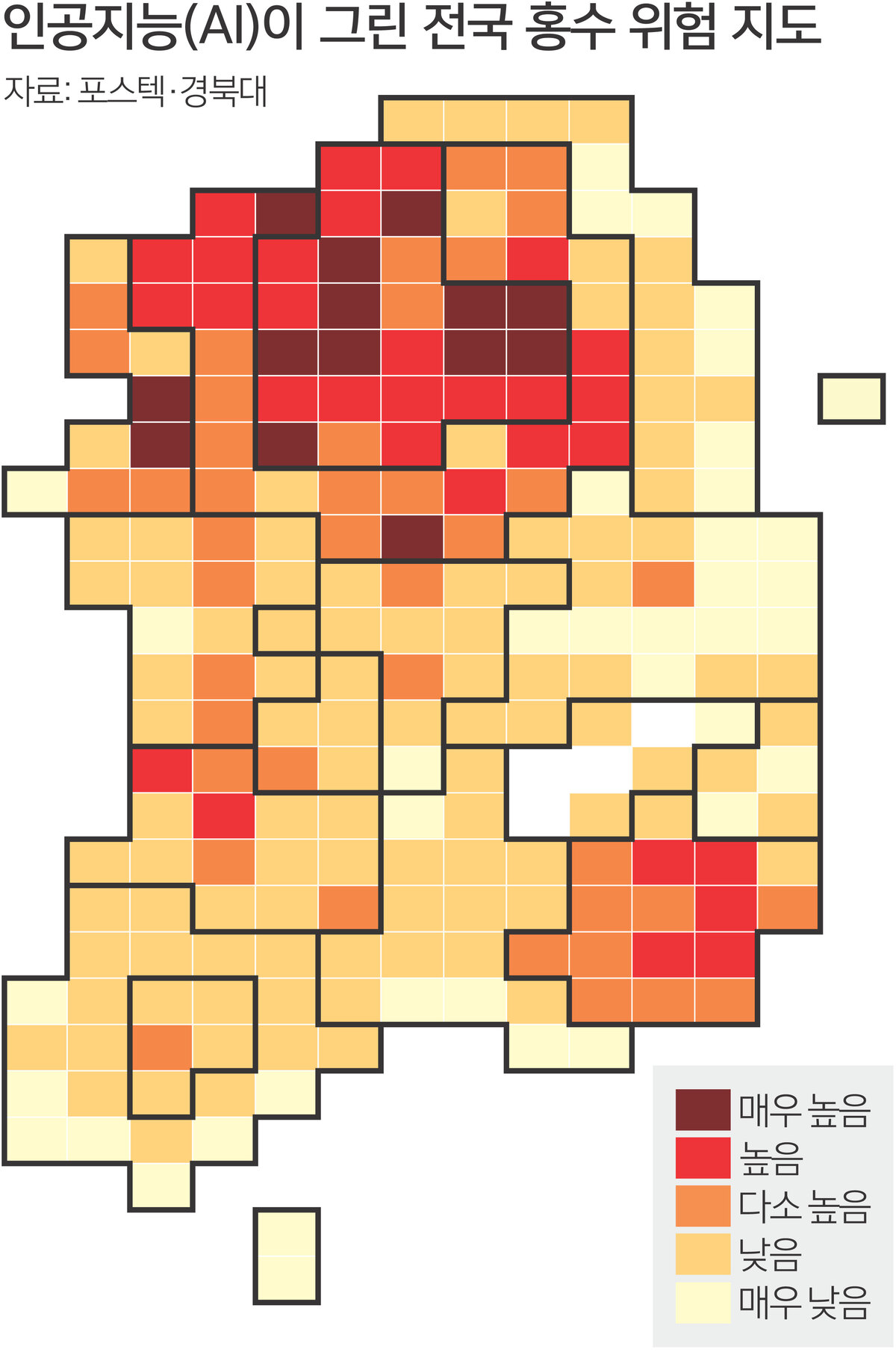 포스텍(포항공대)과 경북대 공동 연구팀은 인공지능(AI)을 활용, 시·군·구별 홍수 위험도를 예측하고 전국의 ‘홍수 위험지도’를 만드는 데 성공했다고 28일 밝혔다.