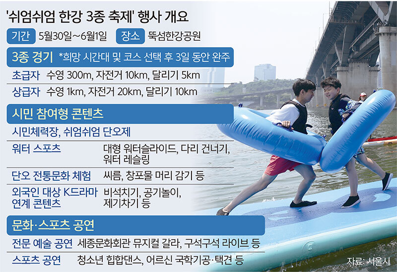 지난해부터 시작된 쉬엄쉬엄 한강 3종 축제는 소수의 강인한 체력을 가진 사람들만 참여하는 기존의 철인 3종 경기와 달리 누구나 부담 없이 참여 가능한 게 특징이다. 시민들이 각자의 속도에 맞춰 3종 경기를 즐길 수 있도록 초보자와 상급자 코스를 나눴고, 시 공유 자전거 ‘따릉이’를 활용하거나 전신슈트 등 장비를 대여할 수 있도록 해 참여 문턱을 대폭 낮췄다.