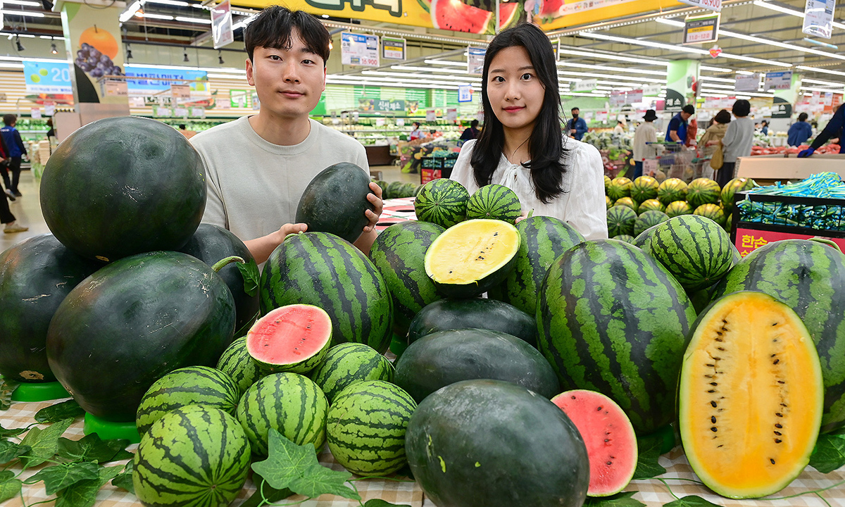 8일 서울 서초구 하나로마트 양재점에서 모델들이 흑피수박, 애플수박, 블랙망고수박 등 다양한 품종의 수박을 선보이고 있다. 여름철 대표 과일 수박의 리코펜 성분은 항산화 작용을 해 노화 방지에 효과가 있는 것으로 알려졌다.