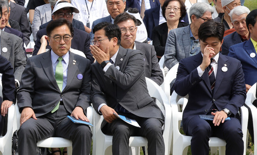 더불어민주당 박찬대 당대표 직무대행 겸 원내대표가 10일 서울 용산구 민주화운동기념관에서 열린 6·10민주항쟁 38주년 기념식 및 민주화운동기념관 개관식에서 우원식 국회의장에게 말을 건네고 있다. 앞줄 왼쪽부터 우 의장, 박 직무대행, 국민의힘 김용태 비상대책위원장.