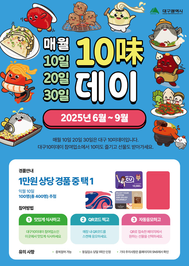 11일 대구시에 따르면 이달부터 9월까지 4개월간 매월 10일·20일·30일을 ‘대구10미데이’로 지정해 다양한 혜택 제공과 이벤트를 펼친다.