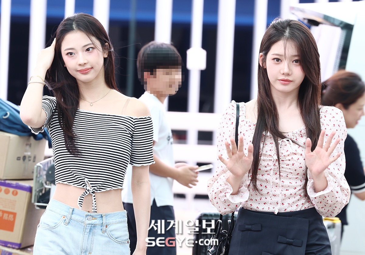 그룹 베이비몬스터 루카(사진 왼쪽)와 로라가 13일 오후 해외 일정 차 인천국제공항을 통해 자카르타로 출국하고 있다.