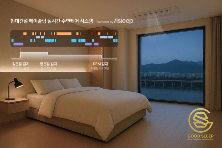 현대건설은 스마트 수면환경 솔루션 ‘헤이슬립(Hey, Sleep)’은 AI 기반 수면 데이터 분석과 자동화 기술을 융합해 조도·습도·환기·차음 등 다양한 수면환경 요소를 통합 제어한다.