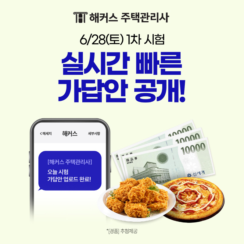 시험 당일인 오늘 실시간 자동채점 서비스를 이용하는 수험생들에게는 추첨을 통해 △신세계 상품권 1만 원권 △피자+콜라세트 △치킨+콜라세트 등 다양한 상품을 제공할 예정이며, 합격 수기 작성 시, 최대 15만 원의 혜택 제공할 예정이다. (*조건 충족 시 / 5만 원 초과 시, 제세공과금 본인 부담)