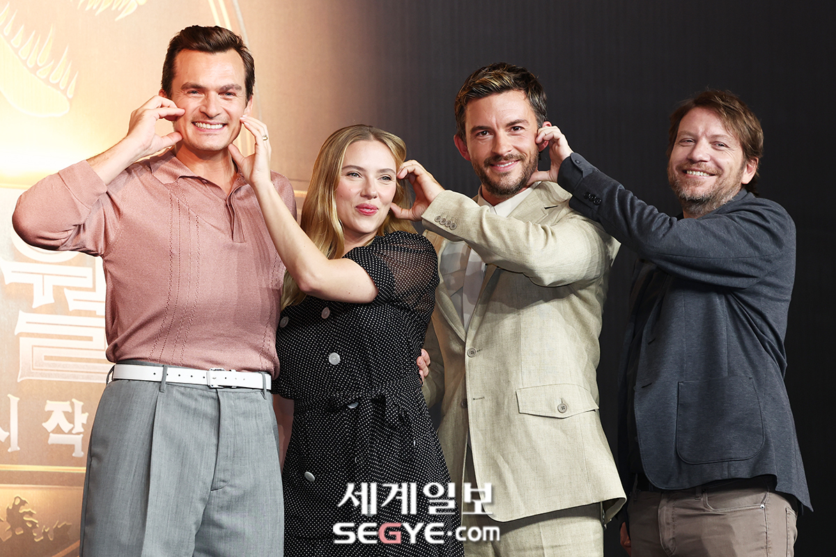 배우 루퍼트 프렌드, 스칼렛 요한슨, 조나단 베일리, 가렛 에드워즈 감독(사진 왼쪽부터)이 1일 포시즌스 호텔 서울에서 진행된 영화 '쥬라기 월드 : 새로운 시작'의 내한 기자회견에 참석해 포즈를 취하고 있다.