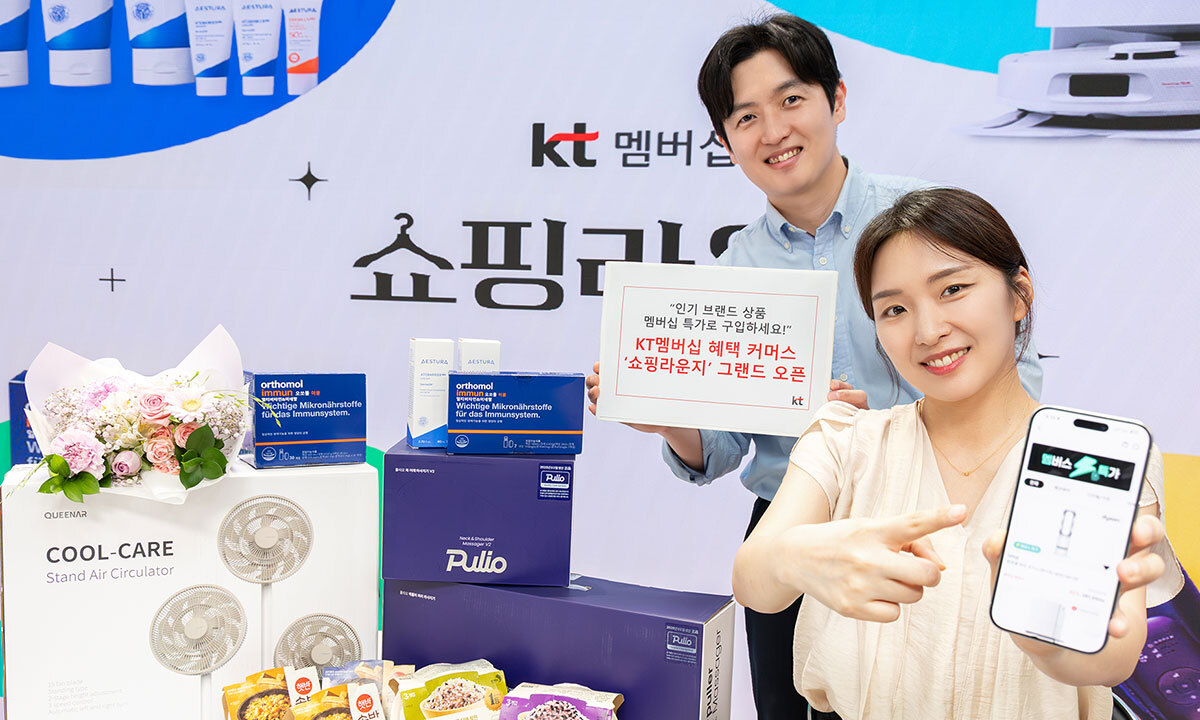 KT가 멤버십 고객 전용 커머스 ‘쇼핑라운지’를 새롭게 오픈, 한 달간 다양한 경품 이벤트를 진행한다고 2일 밝혔다. 모델들이 관련 서비스를 소개하고 있다.