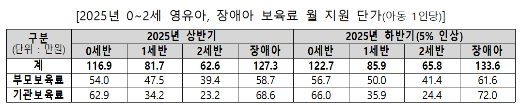 어린이집 0∼2세 보육료 지원 단가가 5% 오른다.