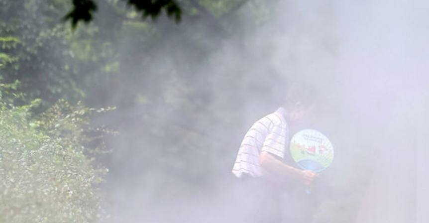 폭염이 연일 계속된 지난 23일 대구 중구 청라언덕에 설치된 쿨링포그 아래로 한 시민이 부채를 들고 이동하고 있다. 뉴시스