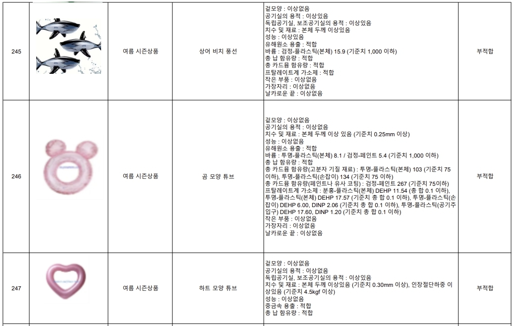 국내 주요 시험검사기관 5곳(KTR, KCL, KATRI, KOTITI, FITI)에 검사를 의뢰해 지난 6~7월 어린이 물놀이용품과 휴가용품 등 여름 시즌 제품 총 249개의 안전성을 점검했다. 이 중 201개 제품(80.7%)이 국내 안전기준을 충족했지만 48개 품목(19.3%)은 기준에 미달했다.