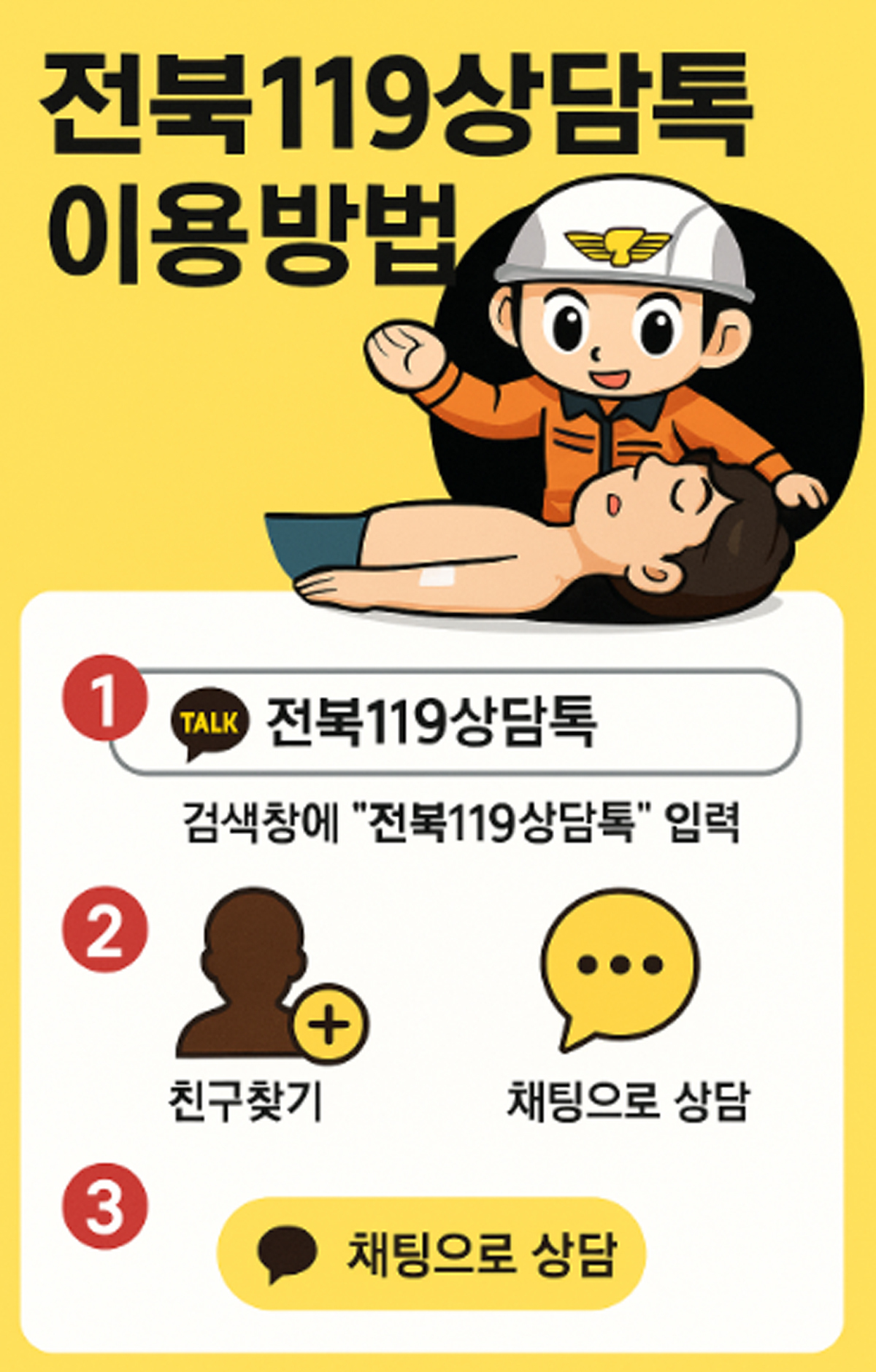 ‘전북 119상담톡’은 카카오톡에서 채널명 ‘전북 119상담톡’을 검색해 친구 추가 후 채팅으로 이용할 수 있다. 병의원 안내, 응급처치 상담, 구급차 출동 요청까지 가능해 기존 음성 기반 신고가 어려운 청각·언어장애인 2만3000여명이 직접적인 혜택을 볼 것으로 기대된다.
