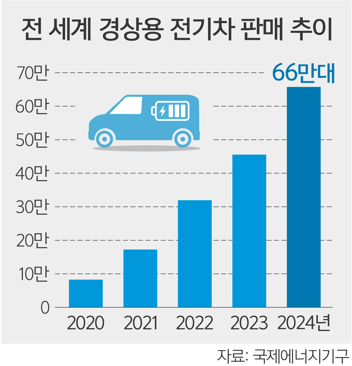 14일 국제에너지기구(IEA)의 ‘글로벌 EV(전기차) 아웃룩 2025’ 보고서에 따르면 지난해 전 세계에서 판매된 경상용 전기차는 66만대로 전년 대비 40% 이상 성장했다.