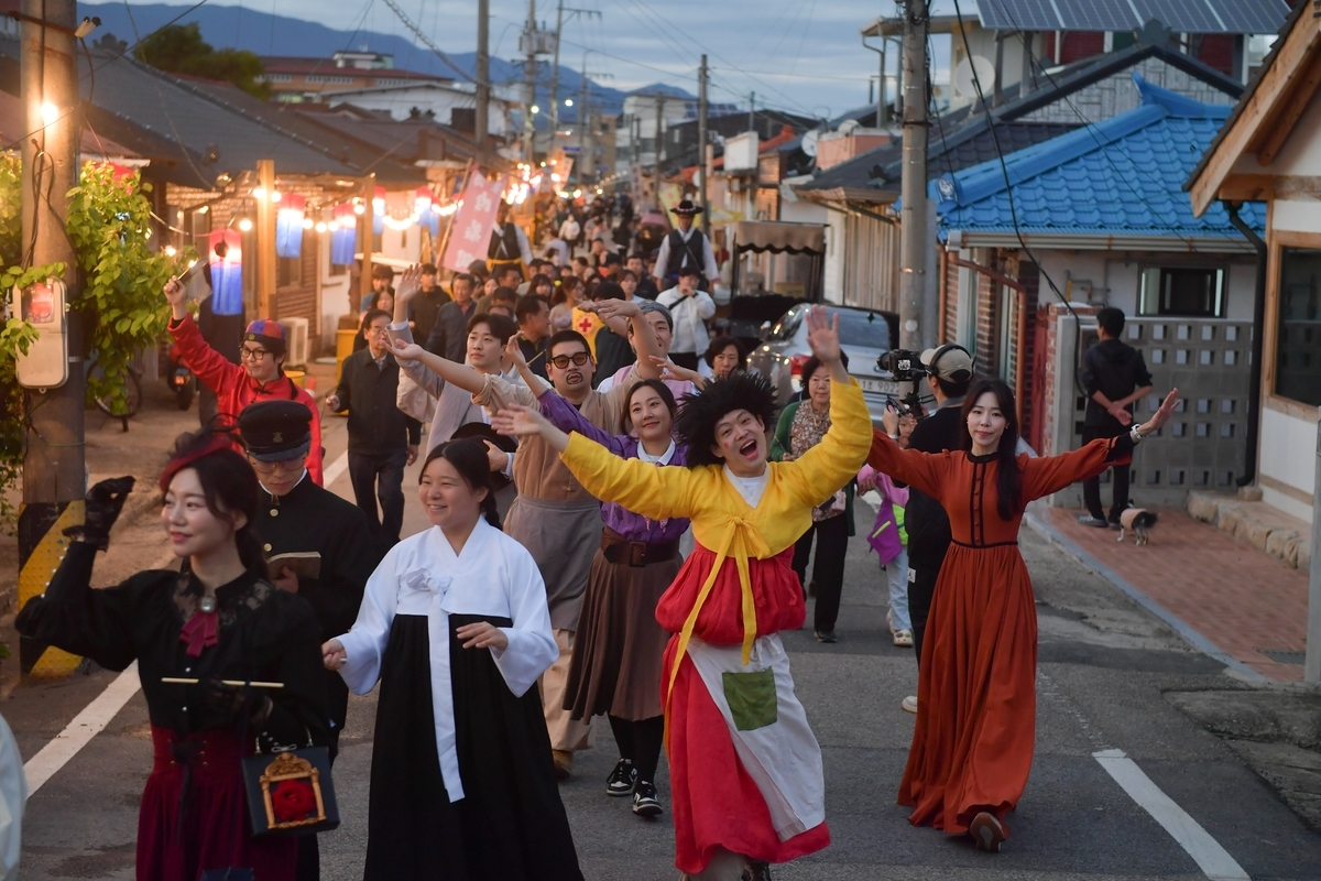 풍물단이 길을 열면 한복과 복고풍 의상을 차려입은 군민과 관광객이 근대거리를 행진하며 100년 전 시끌벅적한 장터거리를 되살린다.
