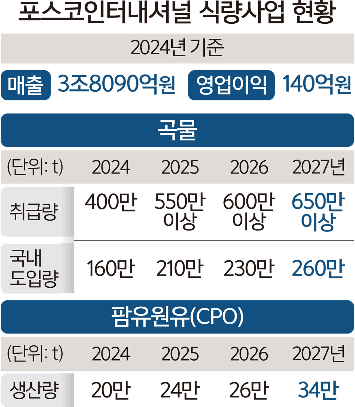 식량 사업 육성은 에너지, 소재와 더불어 포스코인터내셔널이 꼽은 3대 핵심 사업 중 하나다. 2015년부터 식량 사업에 본격 진출한 이후 꾸준히 사업 규모를 확대해왔다. 앞서 포스코인터내셔널은 2030년까지 연간 1000만t의 식량 취급 체제를 구축해 글로벌 식량사업자로 성장한다는 전략을 세웠다.