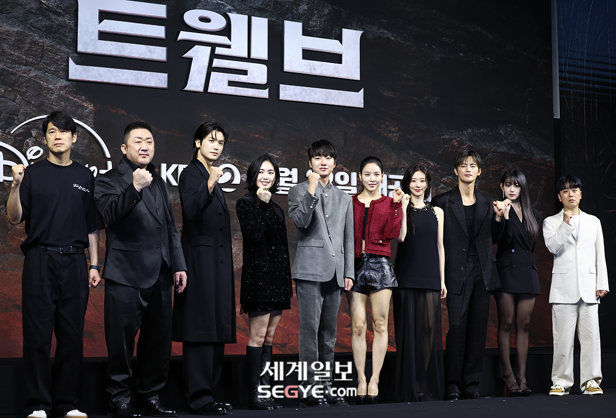 강대규 감독, 배우 마동석, 박형식, 레지나 레이, 성유빈, 안지혜, 이주빈, 서인국, 강미나, 한윤선 감독(사진 왼쪽부터)이 20일 서울 중구 앰배서더 서울 풀만에서 열린 디즈니+ ‘트웰브’ 제작발표회에 참석해 포즈를 취하고 있다.