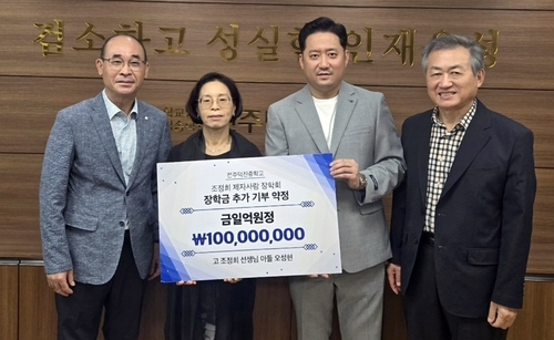 전북 전주덕진중학교는 '조정희 제자 사랑 장학회'의 오성현 회장이 장학회에 1억원의 장학금을 전달했다고 20일 밝혔다.