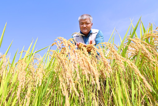 20일 경남 함양군 지곡면 덕암마을 들판에서 한 주민이 잘 익어가는 벼를 살펴보고 있다.