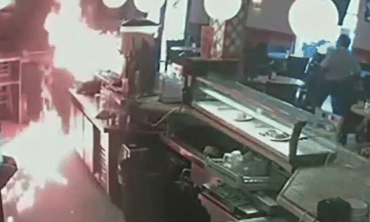 영상에는 남성이 카페를 나가면서 불길이 빠르게 치솟고 고객과 직원들이 대피하는 장면이 담겼다.