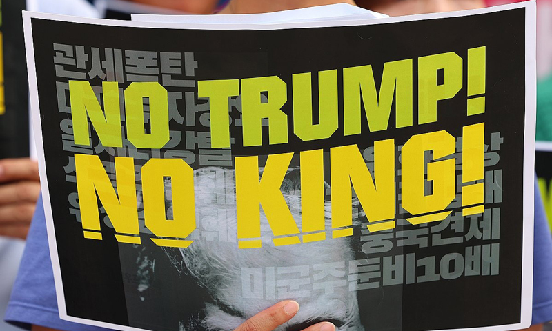 트럼프위협저지공동행동과 자주통일평화연대, 전국민중행동은 오후 광화문 교보문고 앞에 모여 "미국의 강도적 요구는 당장 중단돼야 한다"고 주장했다.