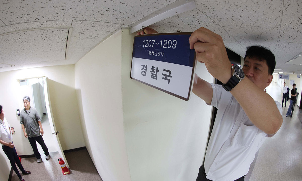 행정안전부 관계자가 26일 서울 정부서울청사 12층에서 경찰국 간판을 떼어내고 있다. 행안부 경찰국은 윤석열정부가 ‘검수완박’(검찰 수사권 완전 박탈)으로 권한이 커진 경찰을 견제하겠다며 2022년 8월 신설한 조직으로, 경찰 독립 침해 등의 논란을 빚다가 ‘행안부와 그 소속기관 직제 개정령’이 시행된 이날 3년 만에 공식 폐지됐다.