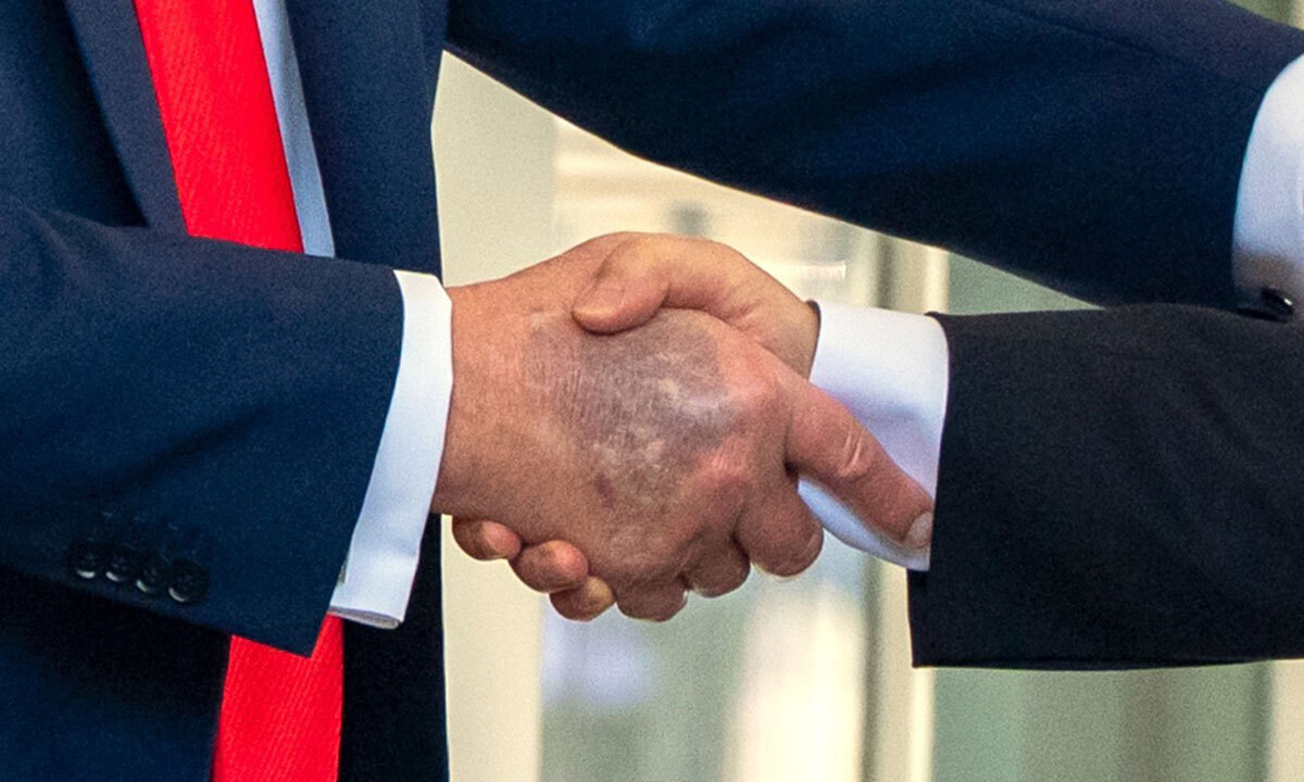 이날 회담 사진과 영상을 보면 트럼프 대통령의 오른손 손등을 상당 부분 덮은 검푸른색 자국이 보인다.