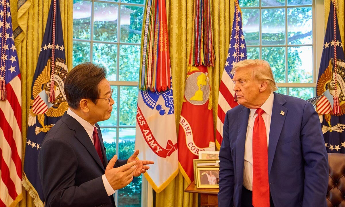 이재명 대통령이 지난 25일(현지시간) 미국 워싱턴DC 백악관에서 열린 한미 정상회담을 마치고 도널드 트럼프 미국 대통령과 대화를 하고 있다. 공동취재