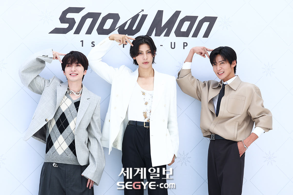 ‘일본 국민 아이돌’ 스노우맨(Snow Man) 후카자와 타츠야, 라울, 메구로 렌(사진 왼쪽부터)이 29일 서울 성동구 성수동에서 열린 '한여름 속 한겨울' 팝업스토어 오픈 행사에 참석해 포즈를 취하고 있다.