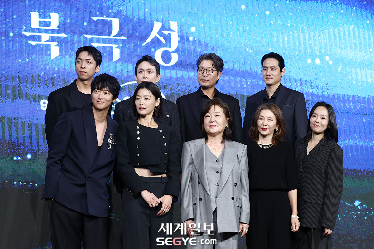 배우 주종혁, 오정세, 유재명, 박해준, 이상희, 이미숙, 김해숙, 전지현, 강동원(사진 왼쪽 위 시계방향)이 2일 서울 종로구 포시즌스 호텔에서 진행된 디즈니 플러스 오리지널 시리즈 '북극성' 제작발표회에 참석하고 있다.