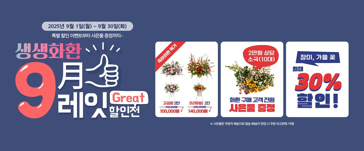 ’9월 9레잇(Great) 할인전’에서는 축하화환, 꽃다발 등 다양한 품목을 최대 30% 할인된 가격으로 선보이며, 화환 구매 고객에게 소국을 증정한다.